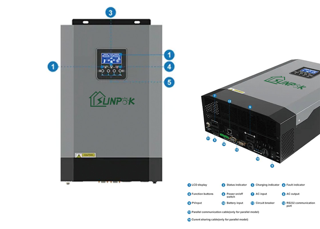 Sunpok 5Kw सिंगल-फेज हाई-फ्रीक्वेंसी ऑफ-ग्रिड इन्वर्टर बिना बिजली वाले क्षेत्रों, खानाबदोश क्षेत्रों, संचार बेस स्टेशनों, अस्थिर शक्ति वाले क्षेत्रों, द्वीपों, सीमा चौकियों, सुंदर प्रबंधन कार्यालयों, न्यूज़स्टैंड, बैटरी निर्माताओं के लिए बैटरी पैक आदि के लिए उपयुक्त है। एलईडी डिस्प्ले से लैस, USB/RS232/RS485/ब्लूटूथ/ड्राई-कॉन्टैक्ट, कॉम्पैक्ट डिज़ाइन और उच्च-लागत प्रदर्शन का समर्थन करता है।